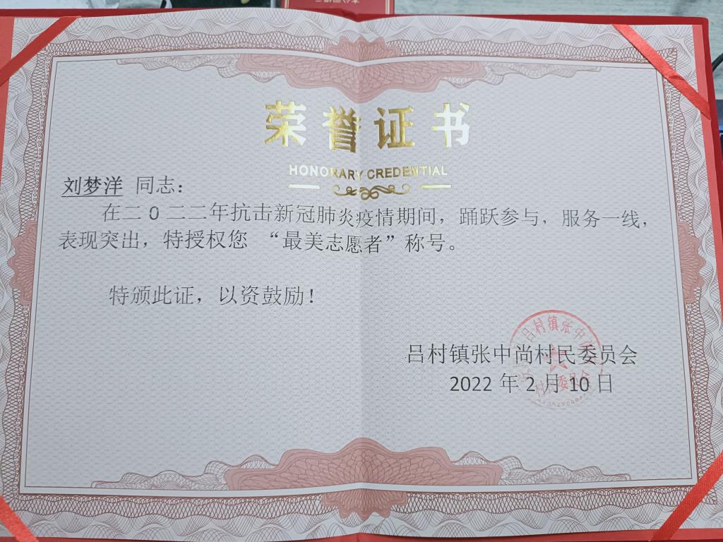 在县团委及老员工联盟的引导下,刘梦洋同学身为当地乡镇老员工联盟负责人,积极带领当地老员工参与到抗疫工作中去,为当地的疫情防控工作贡献力量,推动疫情防控工作有序进行。他积极配合医护人员进行核酸检测采样工作,打印张贴“扫码通行”的疫情防控提示,拉警戒线并组织大家有序排队,用手机将村民的信息录入核酸检测信息系统。每次的志愿工作他都提前到场地待命,尽管天气寒冷,志愿服务过程中手脚冰凉,但他仍坚守岗位、迎难而上、挺身而出。他用实际行动完美展现了一个新时代老员工的风采,在抗疫战场上筑起了坚强的“青春堤坝”。