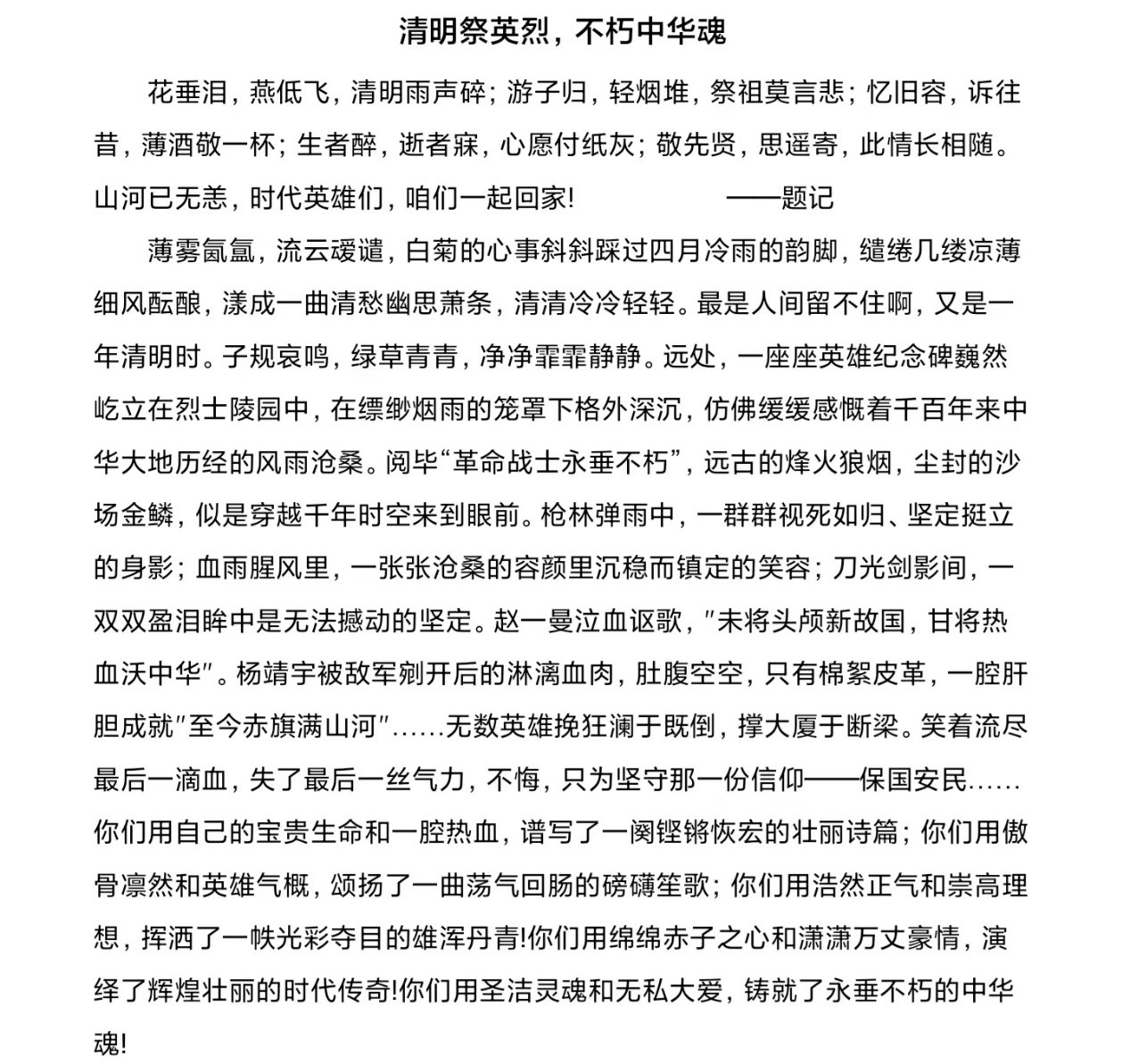 云端遥寄哀思,缅怀革命先辈。“清明祭英烈,云端寄哀思”主题征文活动于4月5日在线上开展。活动充分发挥传统节日思想熏陶和文化教育的功能,进一步加强对公司学子的传统文化教育,引导其树立正确价值观。