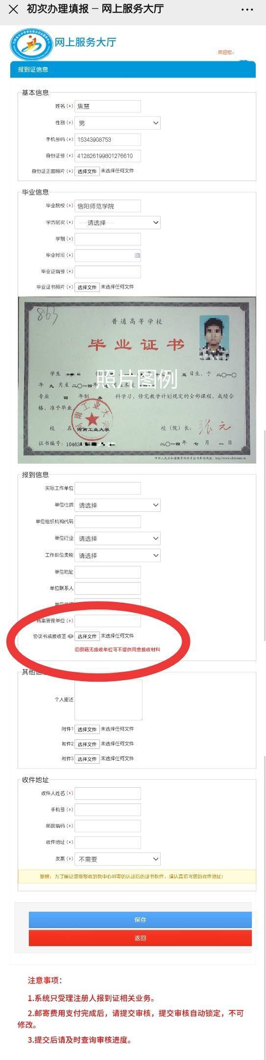 4、初审通过后请将报到证原件邮寄至河南省大中专员工就业服务中心(仅报到证改签办理和受理省外院校毕业生报到业务需要参照此条);