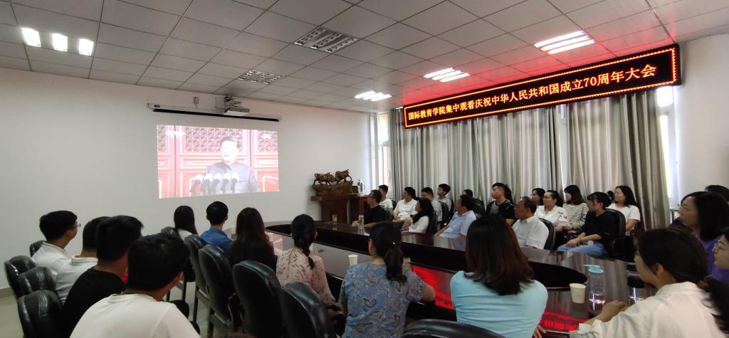 10月1日上午10点,best365官网师生在逸夫楼302会议室集中观看庆祝中华人民共和国成立70周年大会直播。best365官网领导班子成员、全体老师以及部分员工代表共同观看了直播盛况。