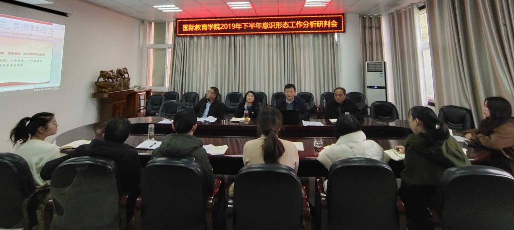 为深入贯彻落实意识形态工作责任制,把意识形态工作各项任务落到实处,12月17日下午,国际教育公司在逸夫楼302会议室召开2019年下半年意识形态工作分析研判会。公司领导班子成员,科级干部以及辅导员班主任参加。会议由姚新春主持。